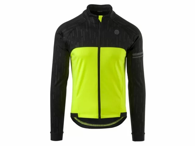 Med denne jakke er du synlig i trafikken. Den er gul på fronten og er dækket af reflekser.