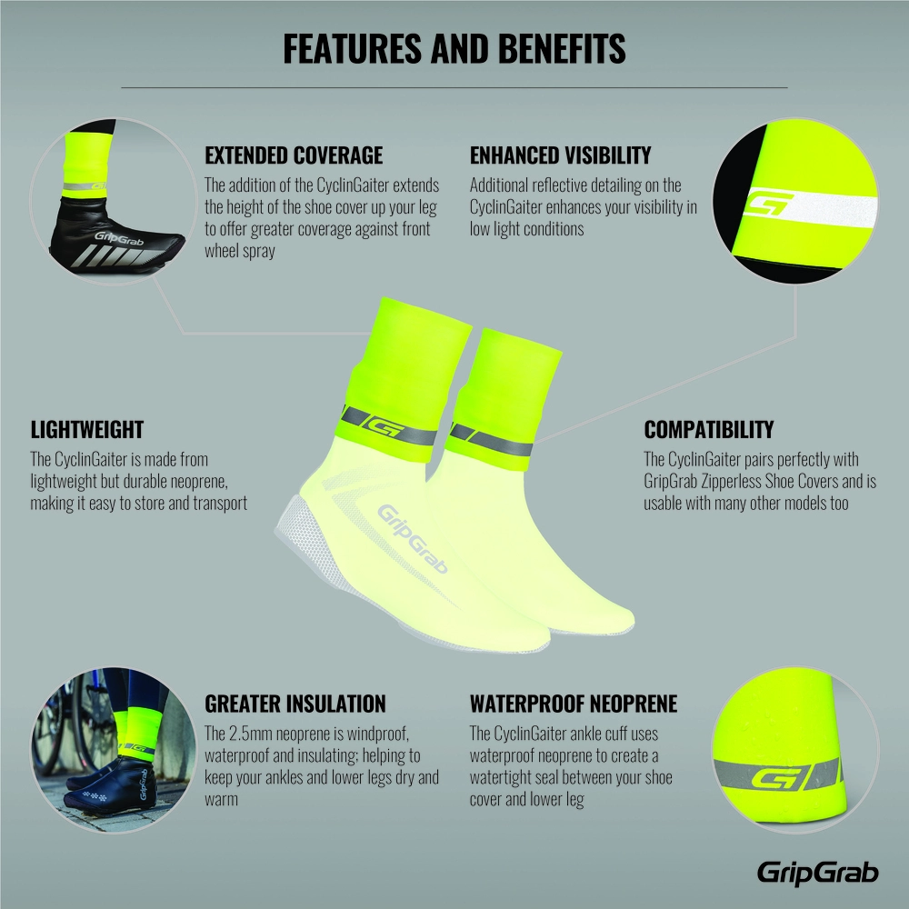 CyclinGaitor er stykket, der skal holde dine sko og skoovertræk tørre. De rulles op på benene før du tager dine sko og skoovertræk på. Når du har det på, så rulles CyclinGaitor nedover skoovertræk eller vinterstøvler og holder regnen ude.