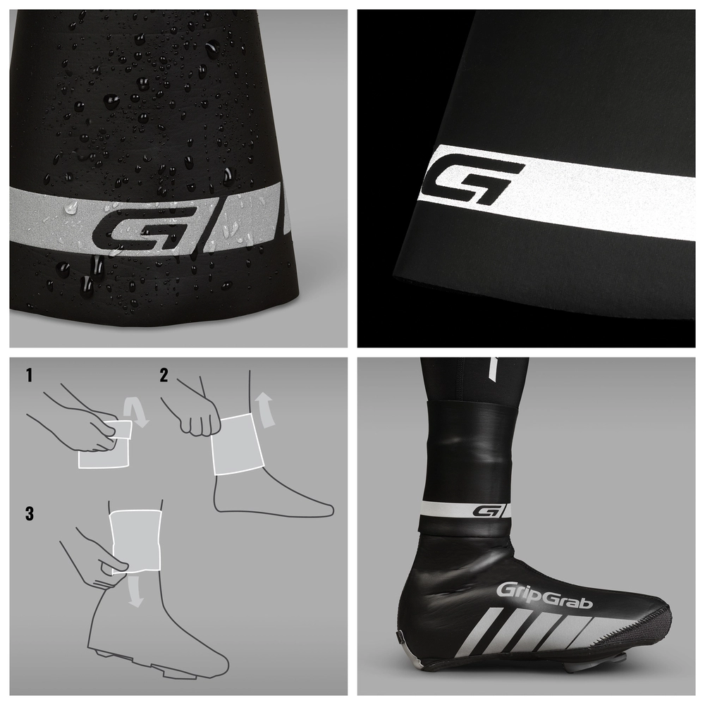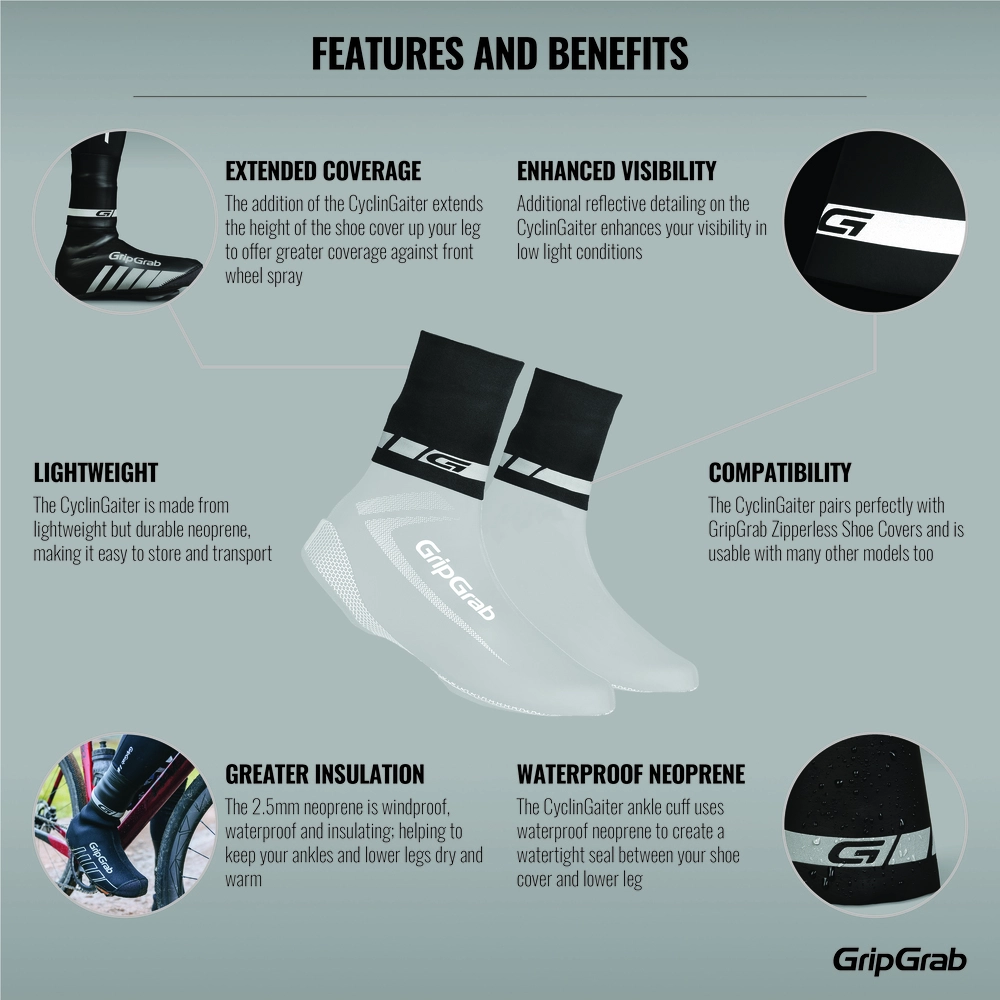 CyclinGaitor er stykket, der skal holde dine sko og skoovertræk tørre. De rulles op på benene før du tager dine sko og skoovertræk på. Når du har det på, så rulles CyclinGaitor nedover skoovertræk eller vinterstøvler og holder regnen ude.
