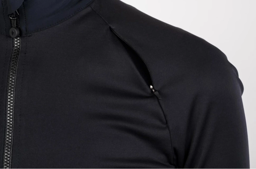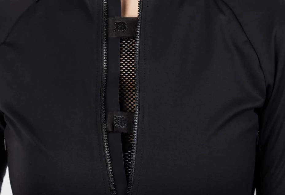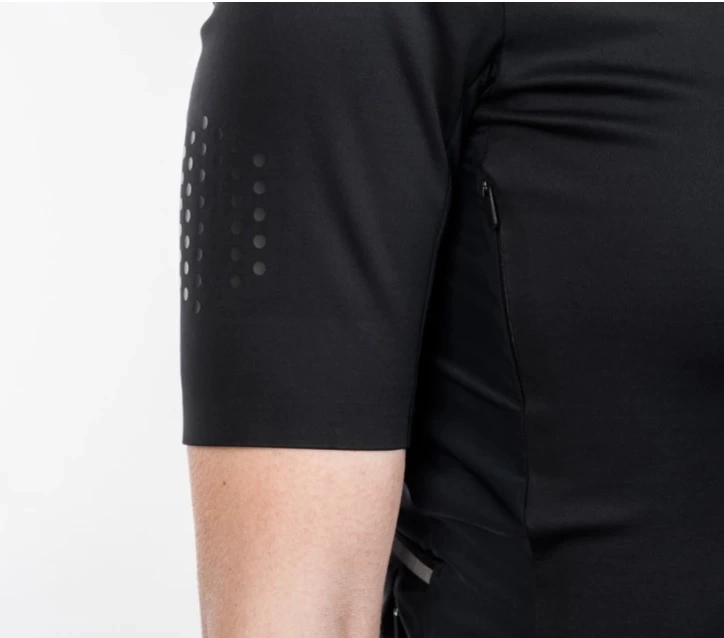 Fire åbninger i den forreste del af trøjen beskyttet af skjulte lynlåse giver dig mulighed for at ventilere efter behov, mens to skjulte bagklapper på tværs af skuldrene fungerer som udstødningsgæller for at lade kropsvarmen undslippe. Brugte stoffer er lette og åndbare stoffer, men samtidig vandafvisende og vindtæt. Jersey har minimum branding, og stærkt fokus er på produkternes levetid.